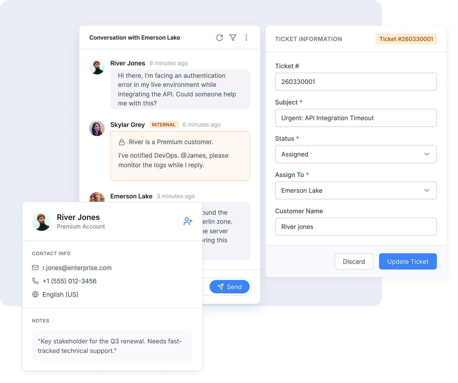Easily collaborate across teams with shared ticket views, internal notes, and collision detection to ensure multiple agents aren’t working on the same issue.