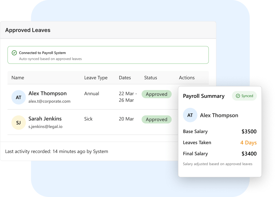 Ensure accurate salary calculations by syncing approved leave data directly with payroll systems.