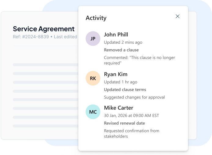 Stakeholders can collaborate from a single interface where every edit, comment, and approval happens instantly. Eliminate endless email threads and version confusion with tracked changes and AI powered insights that keep everyone aligned.