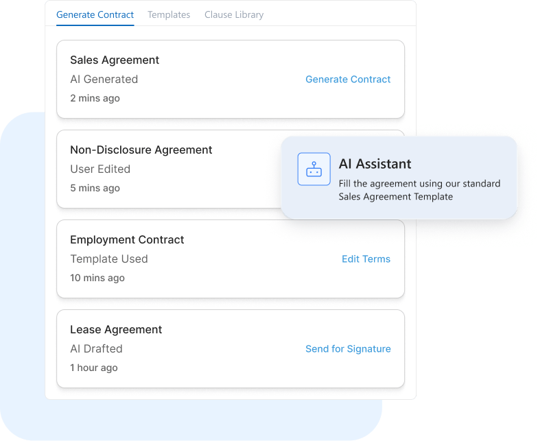 Leverage pre-defined templates and clauses to generate contracts instantly, ensuring every agreement aligns with your business policies and standards.