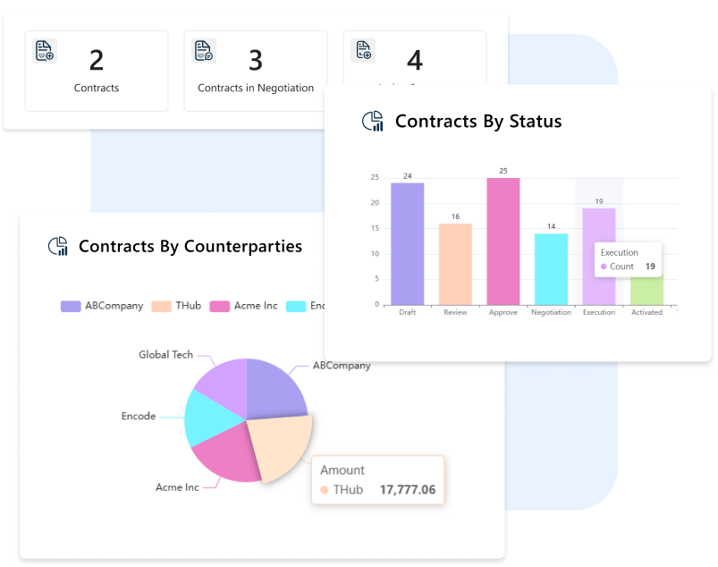 Advanced reporting and customizable dashboards give you complete visibility into contract performance, compliance status, and emerging risks in real time.
