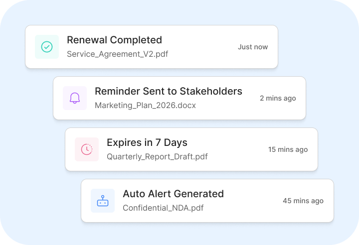 Stay ahead of renewals with instant reminders, and notifications that help you mitigate risk, capture opportunities, and maximize contract value without manual follow ups.