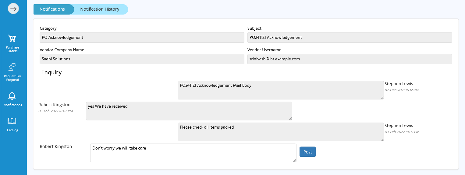 Suppliers can view and access the details of purchase orders (POs), such as quantity, price, payment terms, taxes, and more. Vendors can also send acknowledgments as acceptance for POs.
